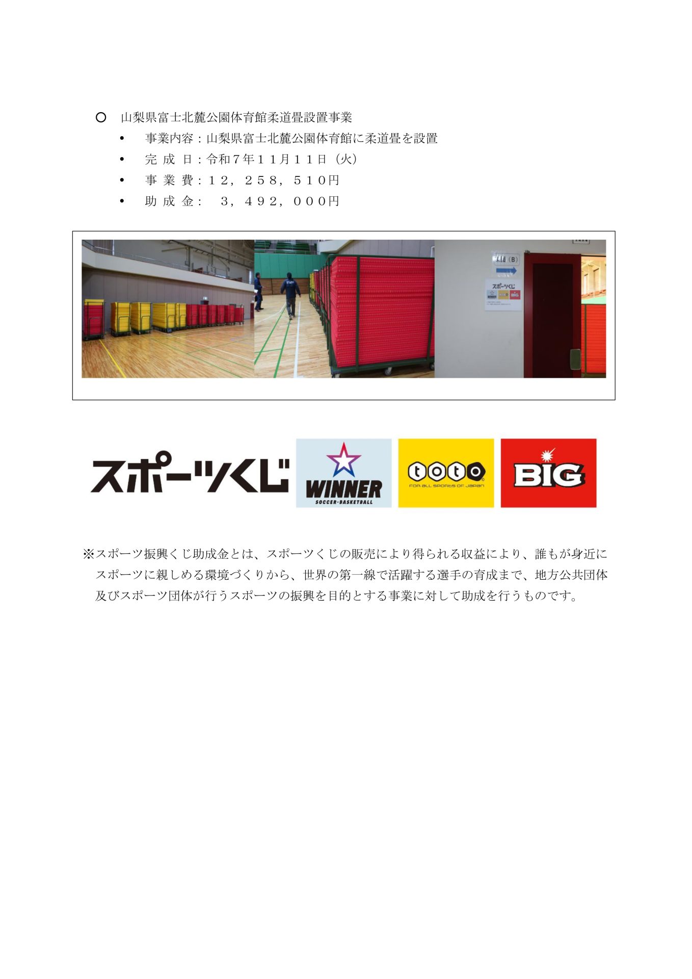 2025年11月23日 その他 スポーツ振興くじ(toto・BIG)助成金を受け柔道畳を購入しました 独立行政法人日本スポーツ振興センターの令和7年度スポーツ振興くじ(toto・BIG)助成金を受け、富士北麓公園体育館メインアリーナへ柔道畳を購入しました。